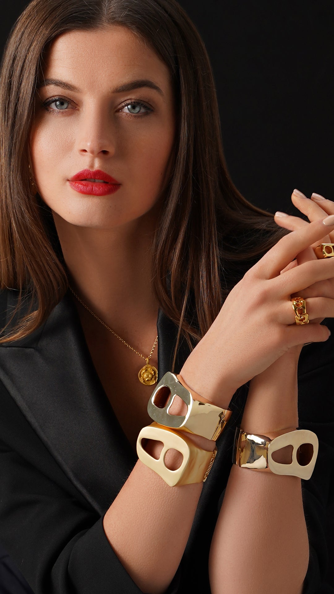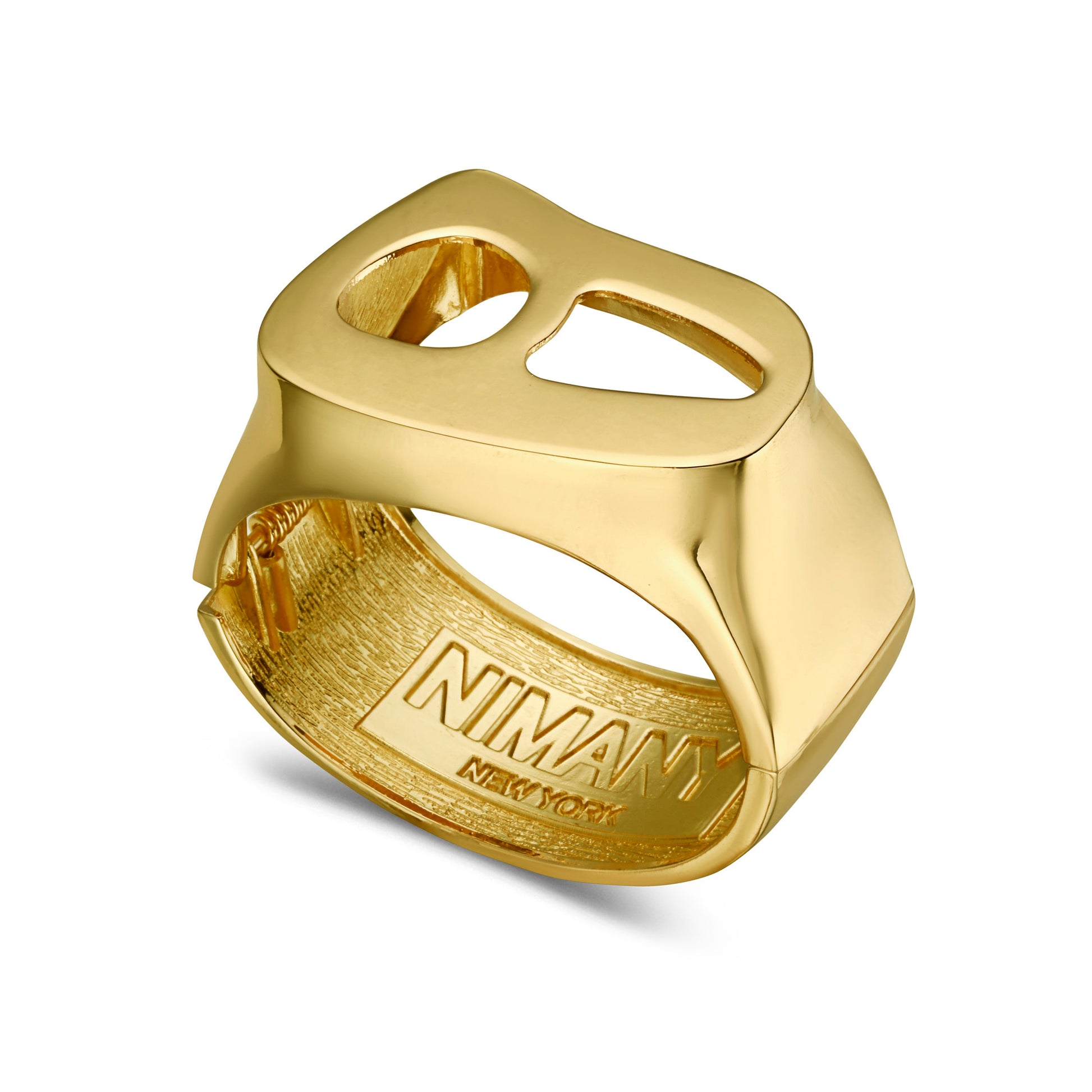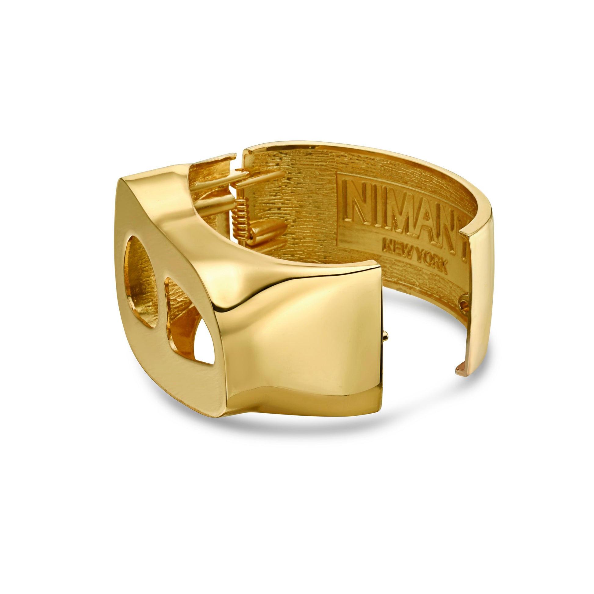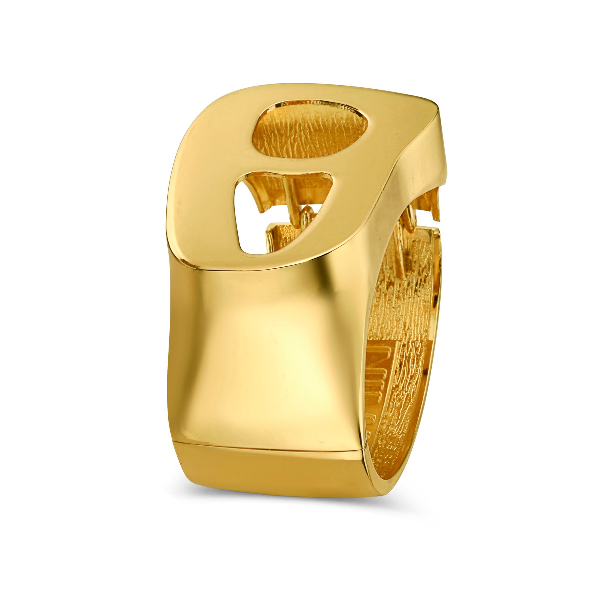 Polished yellow gold plated bracelet cuff with hinged snap closure. Designed with unique 3D shape and balanced weight to provide maximum comfort on the wrist. Make a bold statement with these oversized iconic bracelet cuffs.