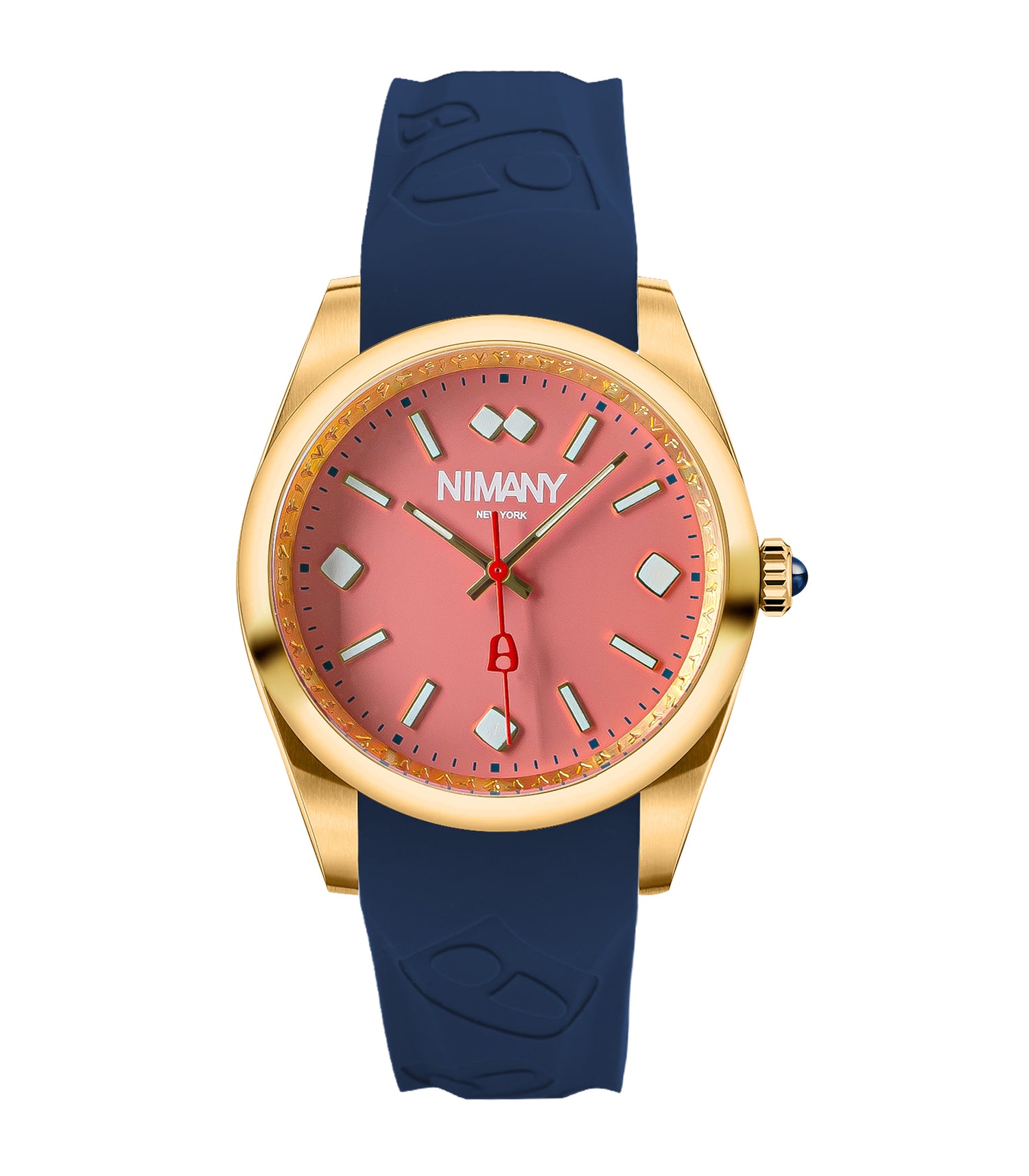 Leather or rubber straps, gold or silver case, engraved bezel, detailed dial, typographic dot markers, quartz movement.