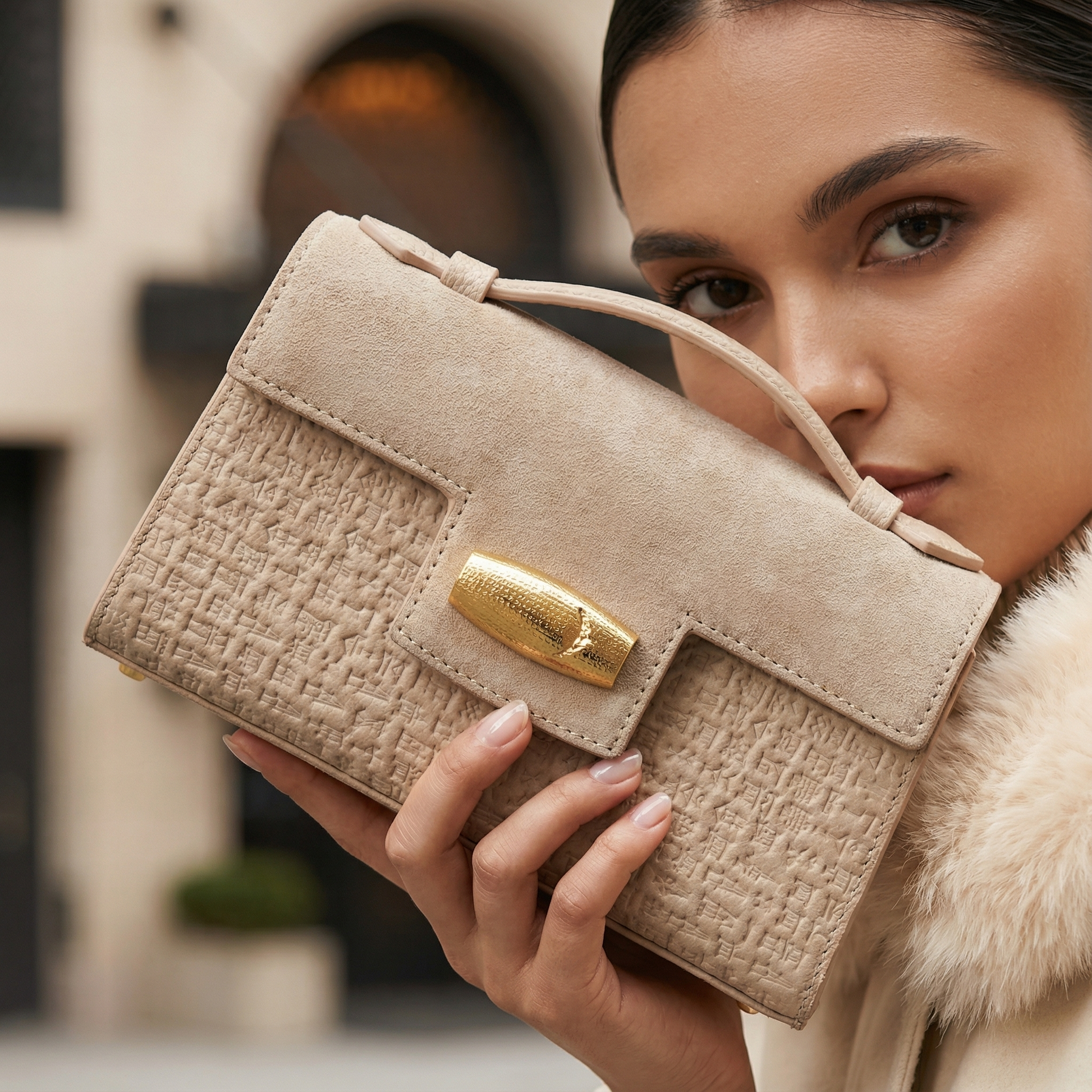 Crafted from premium leather and supple suede, the Cyrus the Great Pochette is a top-handle masterpiece that blends cultural legacy with contemporary design. The body of the bag features an embossed excerpt from the iconic Cyrus Cylinder—one of the world’s earliest declarations of human rights—while the bold magnetic lock is sculpted after the cylinder itself, serving as a striking focal point.