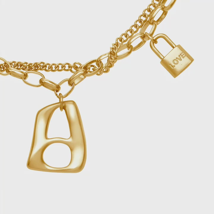 Introducing the Love Story Necklace — a bold statement piece crafted in 18k gold-plated steel. This layered chain design features a collection of signature charms, each symbolizing a moment in a love story. The centerpiece is NIMANY’s sculptural pendant icon (45mm x 40mm, 5mm thick), paired with delicate padlock charms engraved with subtle expressions of love. Adjustable between 16–17 inches (40–43 cm) for a perfect fit. Wear it as a modern heirloom that tells your own story.
