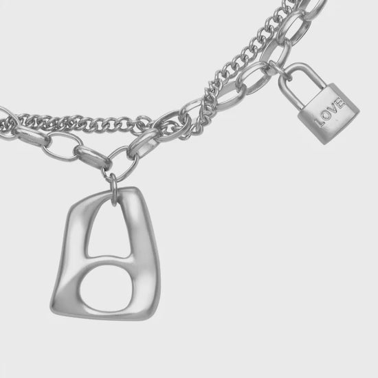 Introducing the Love Story Necklace — a bold statement piece crafted in Stainless Steel This layered chain design features a collection of signature charms, each symbolizing a moment in a love story. The centerpiece is NIMANY’s sculptural pendant icon (45mm x 40mm, 5mm thick), paired with delicate padlock charms engraved with subtle expressions of love. Adjustable between 16–17 inches (40–43 cm) for a perfect fit. Wear it as a modern heirloom that tells your own story.