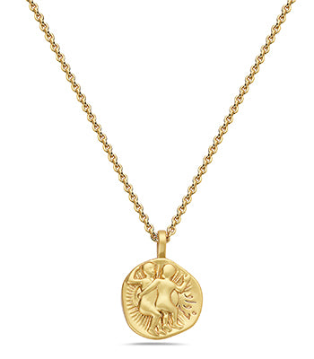 This necklace is a reproduction of the ancient Greek & Middle Eastern Zodiac Coins. The organic deformed shape was preserved to create the ancient look and feel.